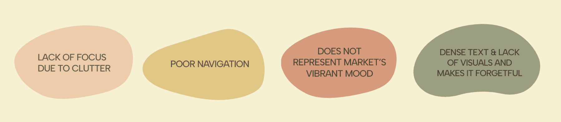 The current visual design of the Eastern Market website presents usability issues for visitors due to an outdated design, inconsistent visual hierarchy, poor navigation, and cluttered layout, leading to difficulty in finding important information.
